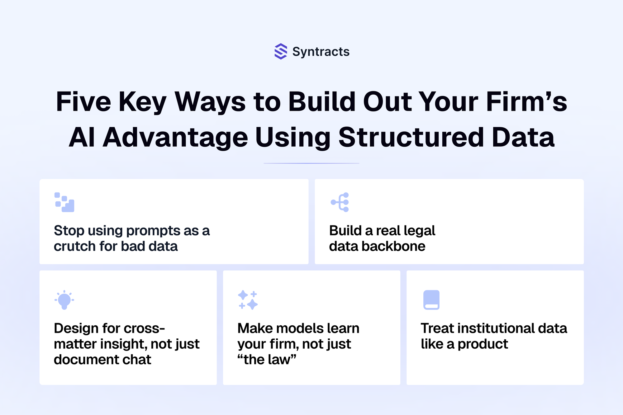 Don’t try to paper over unstructured information with ever-longer instructions. Leading firms treat prompts as a UX layer on top of real data architecture (i.e. schemas, taxonomies, ontologies, etc.). This way, every review and drafting assist leaves behind structured, reusable data instead of disappearing into chat history.